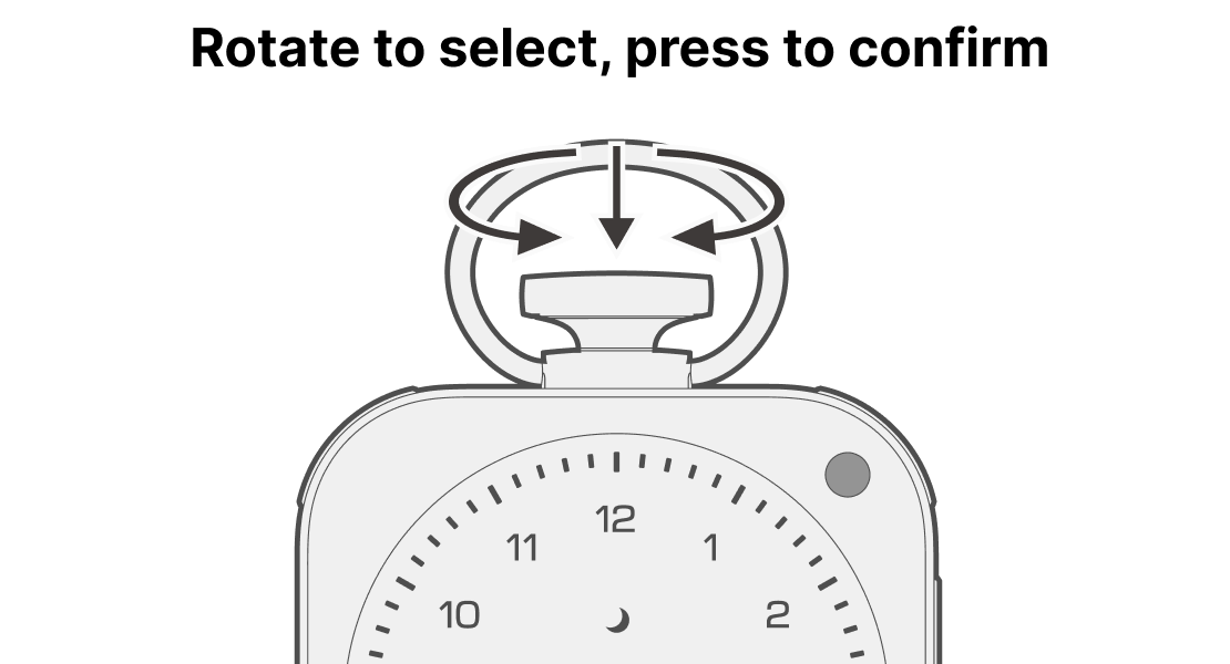 In time setting, set “hour” then “minute” in order. During the “hour” setting, the selected number blinks; rotate the crown to select and press the crown to confirm.
