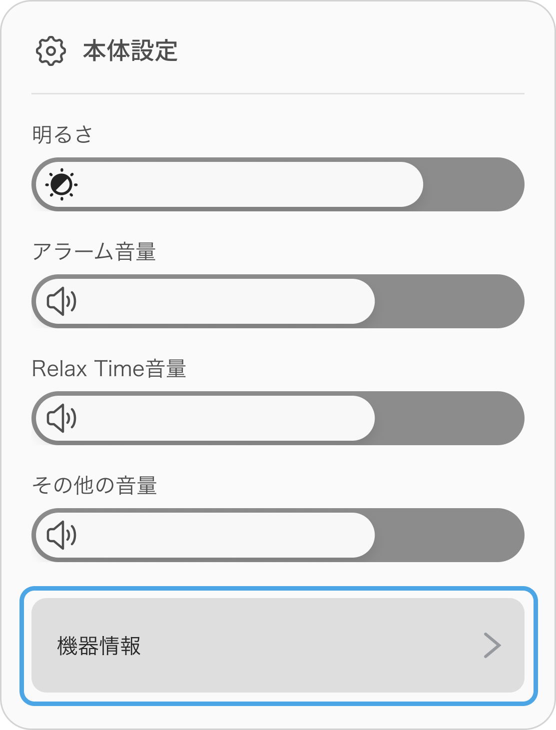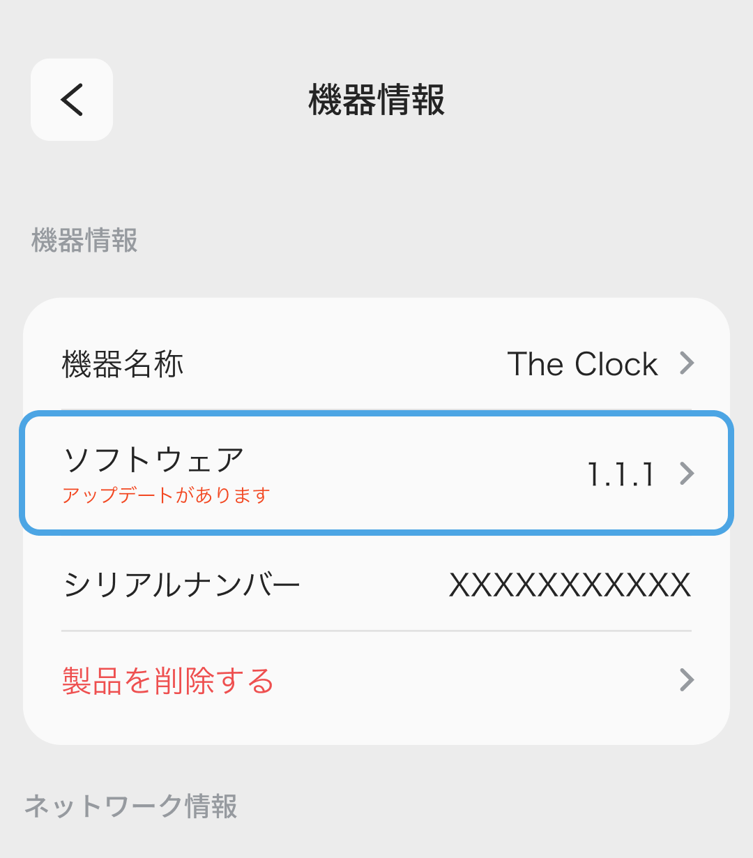 The Clockのソフトウェアアップデートを確認するには、BALMUDA Connectアプリの製品一覧からThe Clockを選び、「機器情報」をタップしてください。
