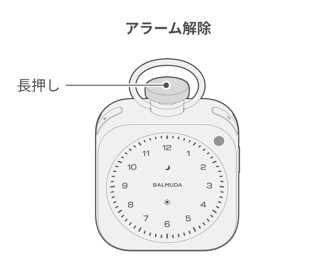 アラームを解除する場合、時計表示状態、もしくはRelaxTime状態のまま太陽ボタンを長押ししてください。アラームが解除されると、太陽LEDが消灯します。