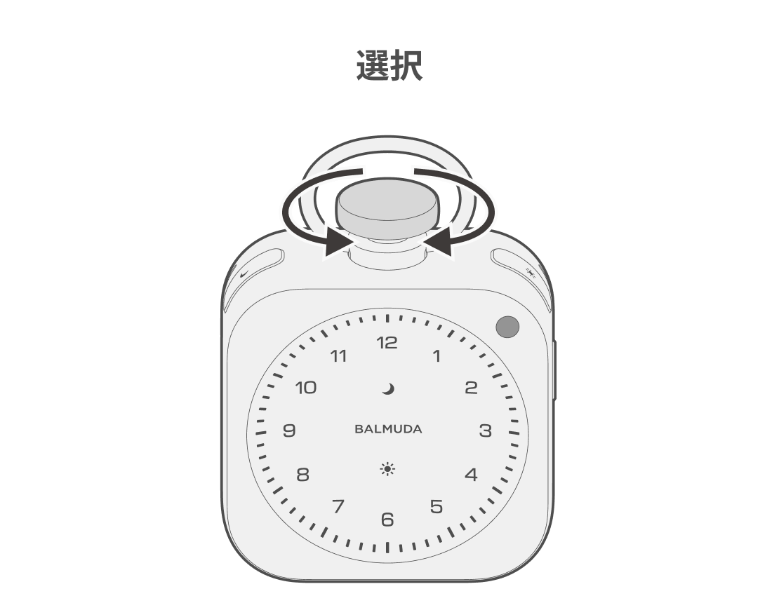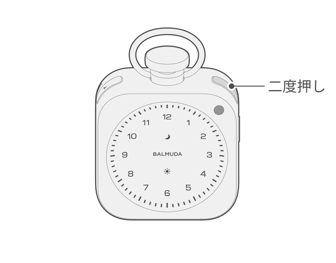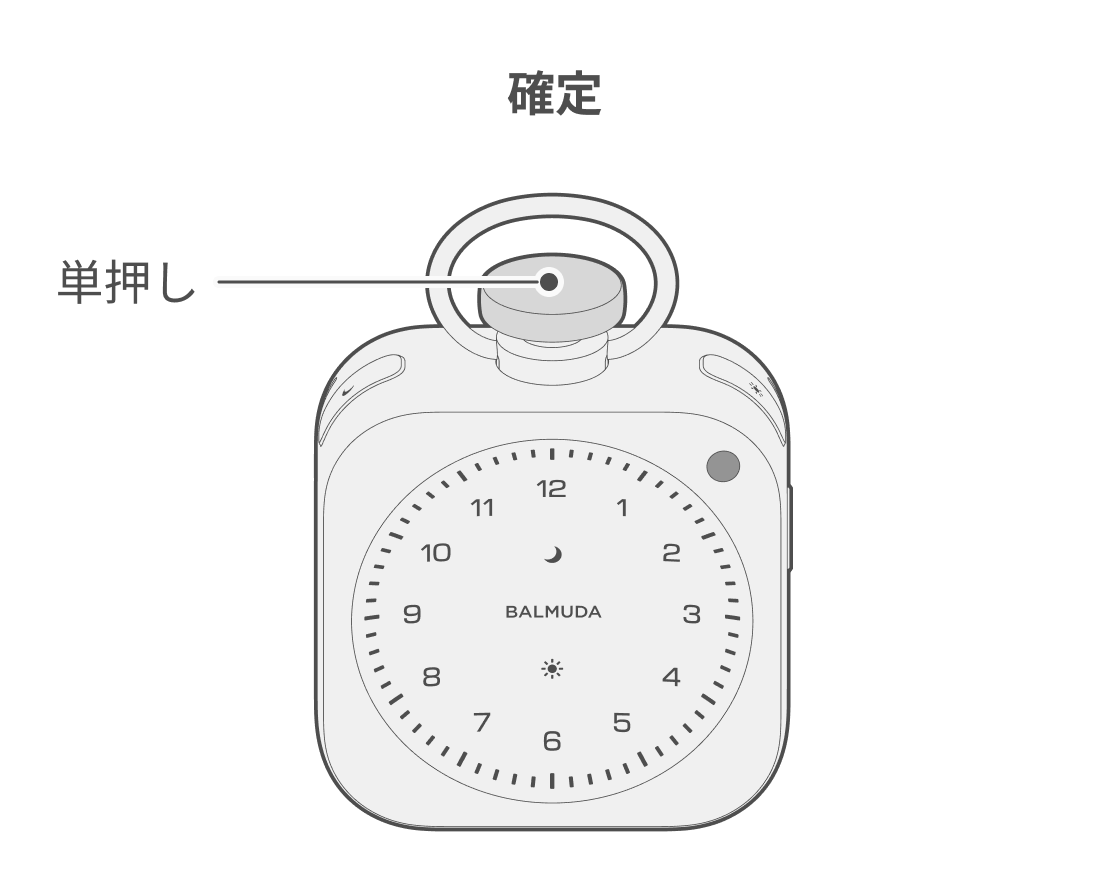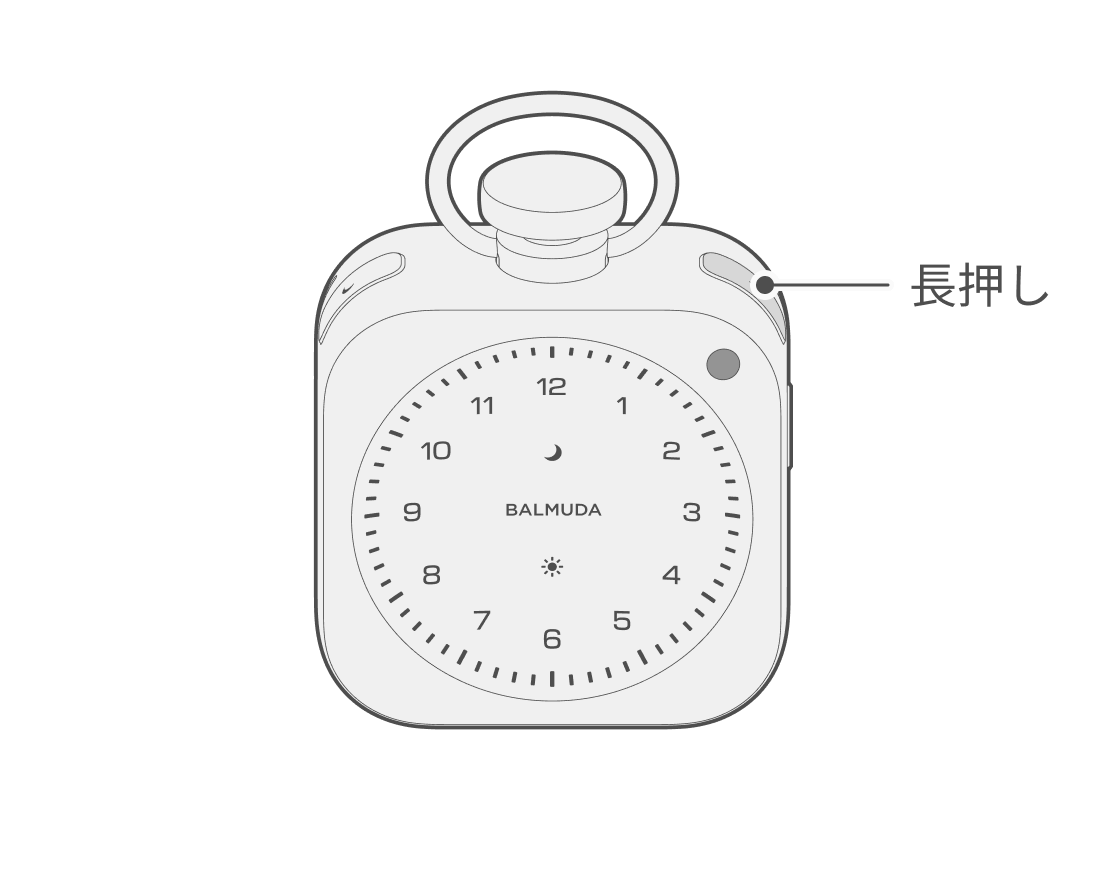 時計表示かRelax Timeの状態で太陽ボタンを長押しすると、本体正面の太陽LEDがゆっくり明滅し、設定状態に入ります。