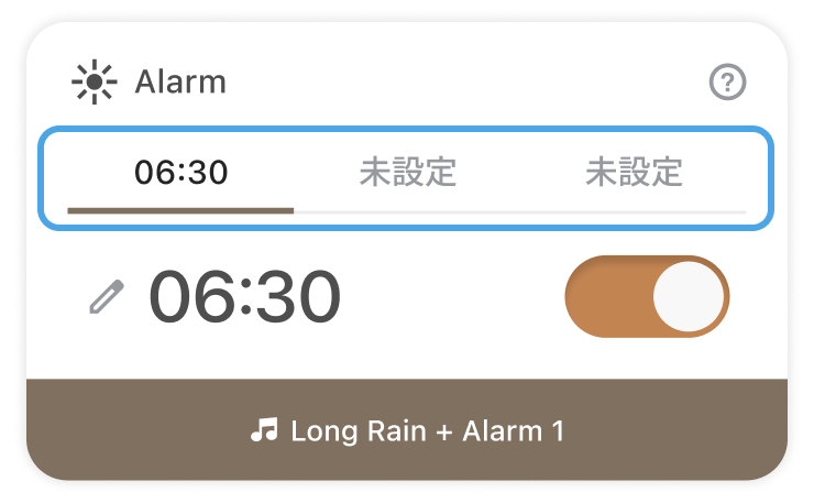 アプリでは、最大3つのプリセット時間を設定して、起床時刻をワンタップで切り替えることができます。製品を追加した時点では、本体にセットされているアラーム時刻が1つ目のプリセットに登録されている状態になっています。