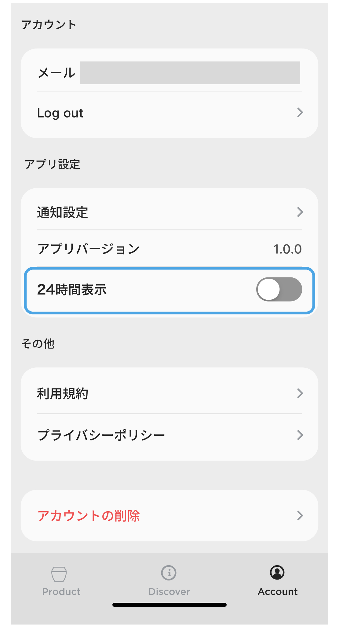 設定は「Account」の「24時間表示」から行うことができます。