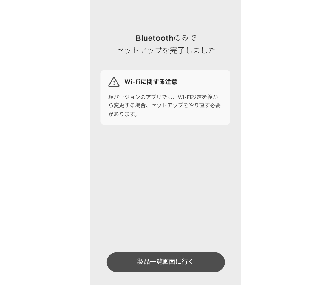 現バージョンのアプリでは、Wi-Fi設定を後から変更する場合、セットアップをやり直す必要があります。詳細は「あとからWi‑Fi接続を設定する場合」をご覧ください。