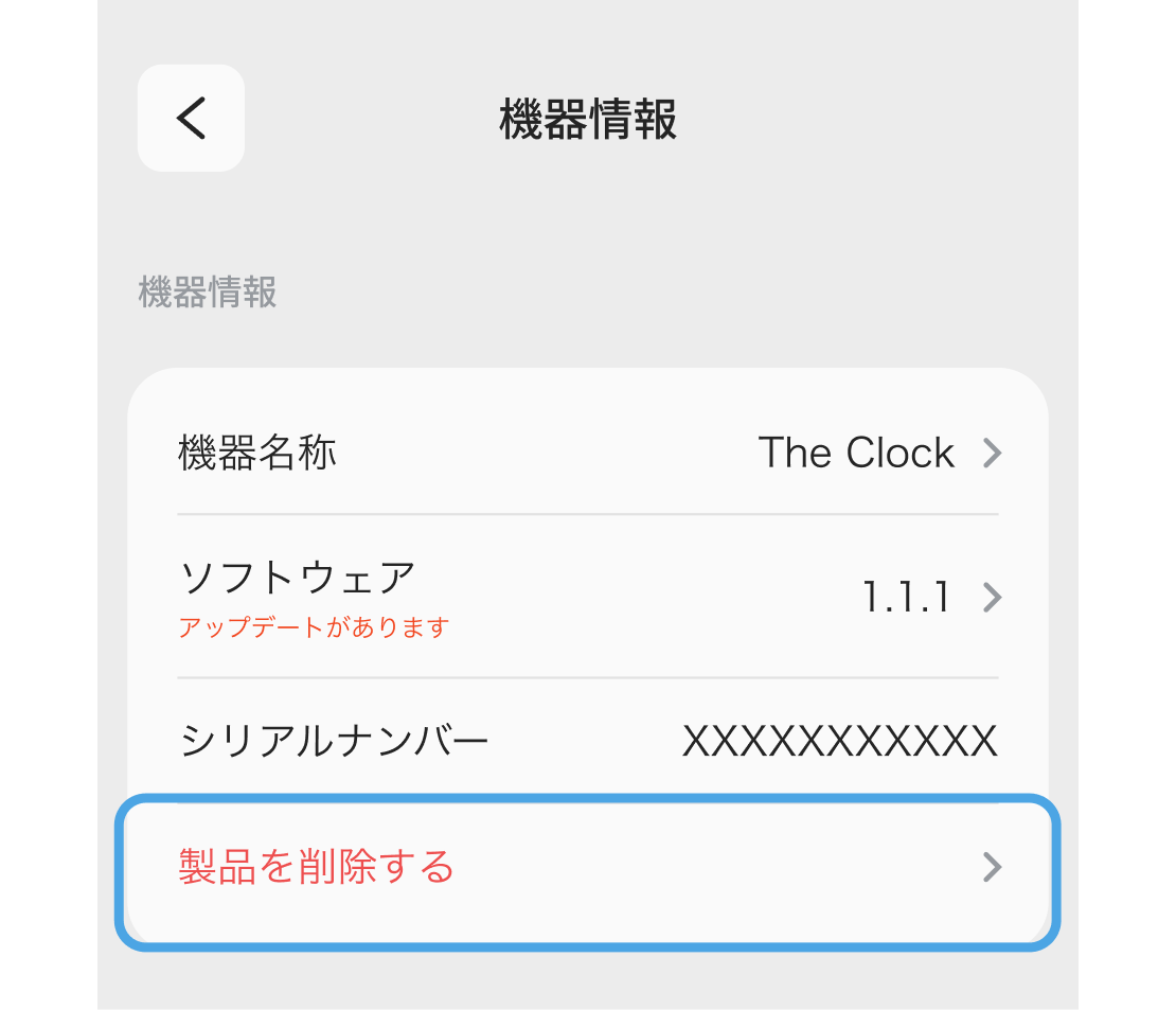 「機器情報」の中にある「製品を削除する」をタップすることで連携を解除することができます。