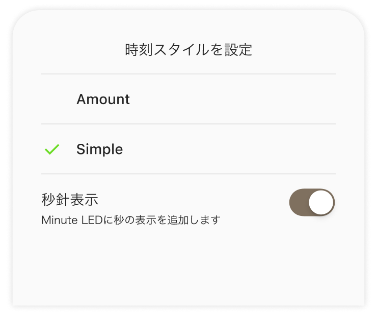 Light Hourの表示スタイルは「Amount(初期設定)」「Simple」の2種類から選べます。表示スタイルの変更は本体およびアプリから行えます。