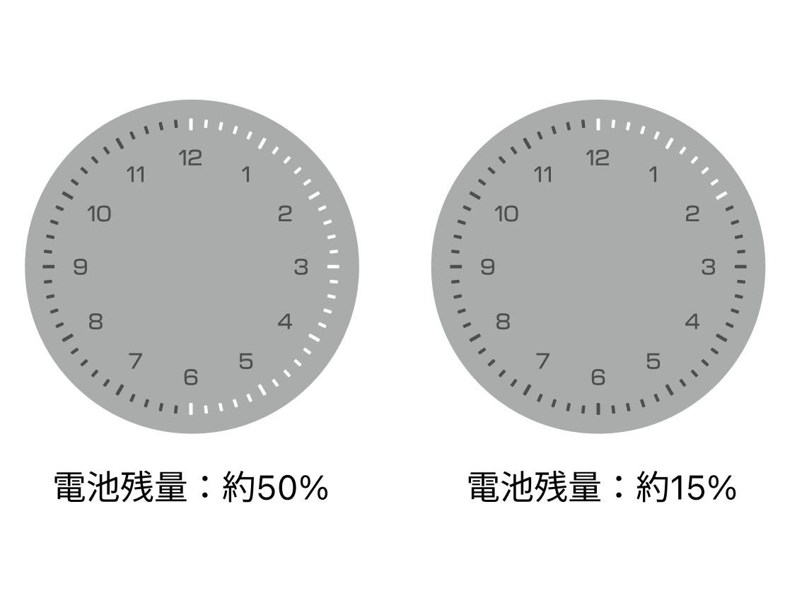 電池残量を6段階で表示し、満充電の場合はMinute LEDがすべて点灯します。電池残量減少とともにMinute LEDが減っていきます。