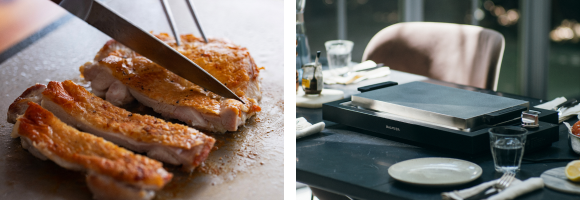 6.6mm厚の3層クラッドプレートと正確な温度制御で、さまざまな料理をプロの味わいに焼きあげます。プレート上でナイフを使って、目の前で切り分け、できたての料理をサーブ。家族や友人が集まる食事も盛り上がることまちがいなしです。