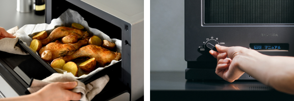 上質なデザインとシンプルな操作性、楽器が奏でる心地よいサウンドにより、いつもの調理が楽しいひとときに変わります。ブイヤベースやローストチキンなどの定番料理から、ケーキなどのテーブルが華やぐスイーツまで。直感的でシンプルなダイヤル操作で、迷うことなくお使いいただけます。