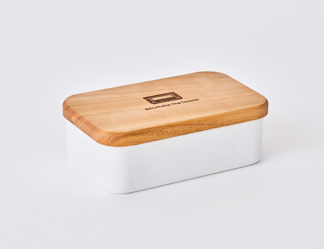 BALMUDA The Toasterの10周年記念ロゴの⼊った野⽥琺瑯のバターケース。本体は、におい移りがなく冷却性に優れたホウロウ製。トースターのイラストを刻印した⽊製の蓋は、カッティングボードとしてもお使いいただけます。